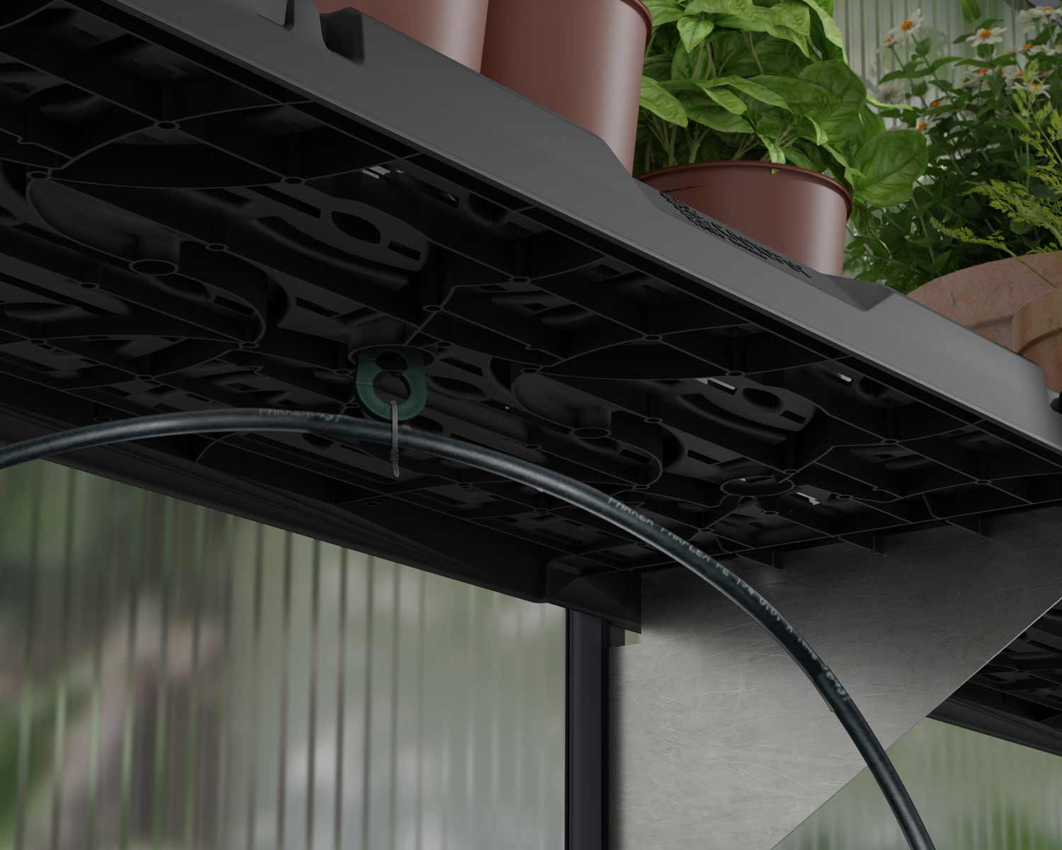 - Montage: Wird an den Rahmen des Gewächshauses geklemmt und kann an jeder Wand oder Ecke angebracht und leicht angepasst und mit anderen Regalen verbunden werden.