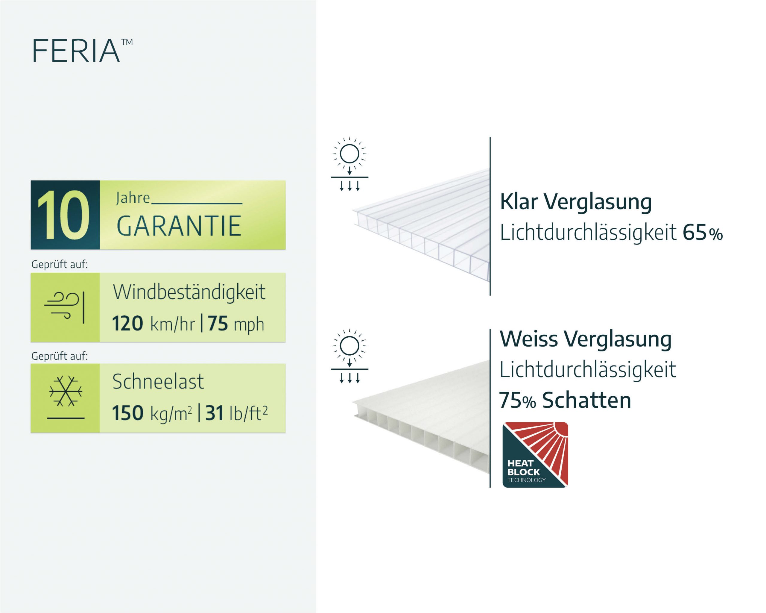 Genießen Sie warme Tage, kühle Nächte und alles zwischendurch unter der extrabreiten Feria-Terrassenüberdachung. Das Feria Terrassenüberdachungs-Bausatz ist eine attraktive, wartungsfreie Überdachungslösung für verschiedene Außenanwendungen wie z.B. eine Terrassenüberdachung, eine Sonnenlounge oder gar ein Carport. Schützen Sie Ihre Wertsachen vor dem unberechenbaren Wetter und den schädlichen UV-Strahlen mit dieser leistungsstarken Konstruktion. Sie verfügt über flexible positionierbare Pfosten, mit denen Sie die gewünschte Höhe am Wandanschluss, den Abstand zum Haus und zwischen den Pfosten an der Vorderseite einstellen können. Es wurde so konzipiert, dass es von 2 Personen einfach zusammengebaut werden kann. Dabei kommt das Click N‘ Lock-Dachsystem zum Einsatz, das eine sichere und einfache Montage ermöglicht und Undichtigkeiten verhindert. Es erfordert keine Erfahrung, keine besonderen Fähigkeiten und kein Spezialwerkzeug. Die Feria Übedachung bietet Ihrer Familie eine elegante, schön gestaltete, robuste Ergänzung zu Ihrem Außenbereich, die viele Jahre lang stabil und rostfrei bleibt.
