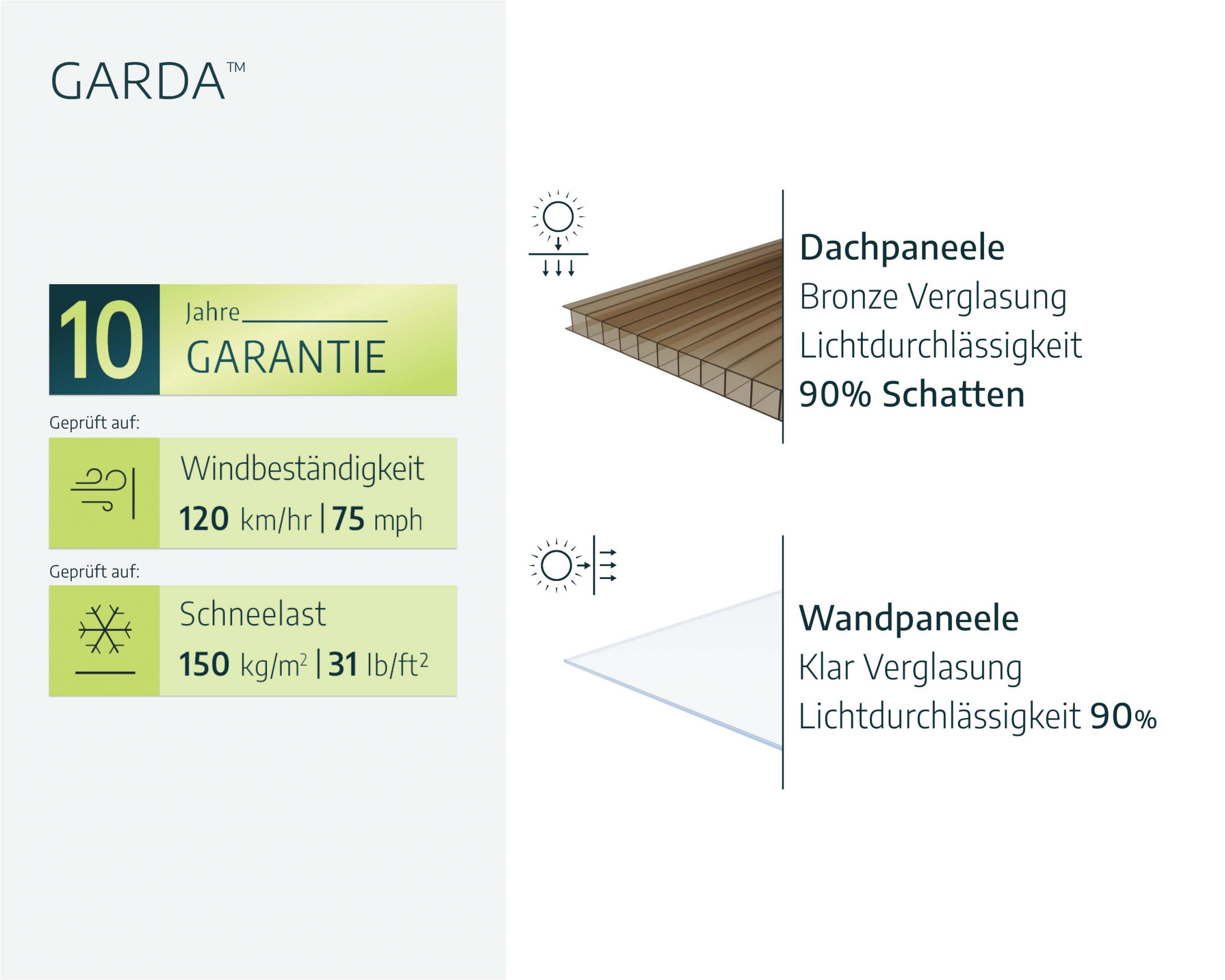 - Behandelte, bronzefarbene Verglasung – lässt das natürliche Sonnenlicht auch an bewölkten Tagen durch und bietet dennoch ausreichend Schatten