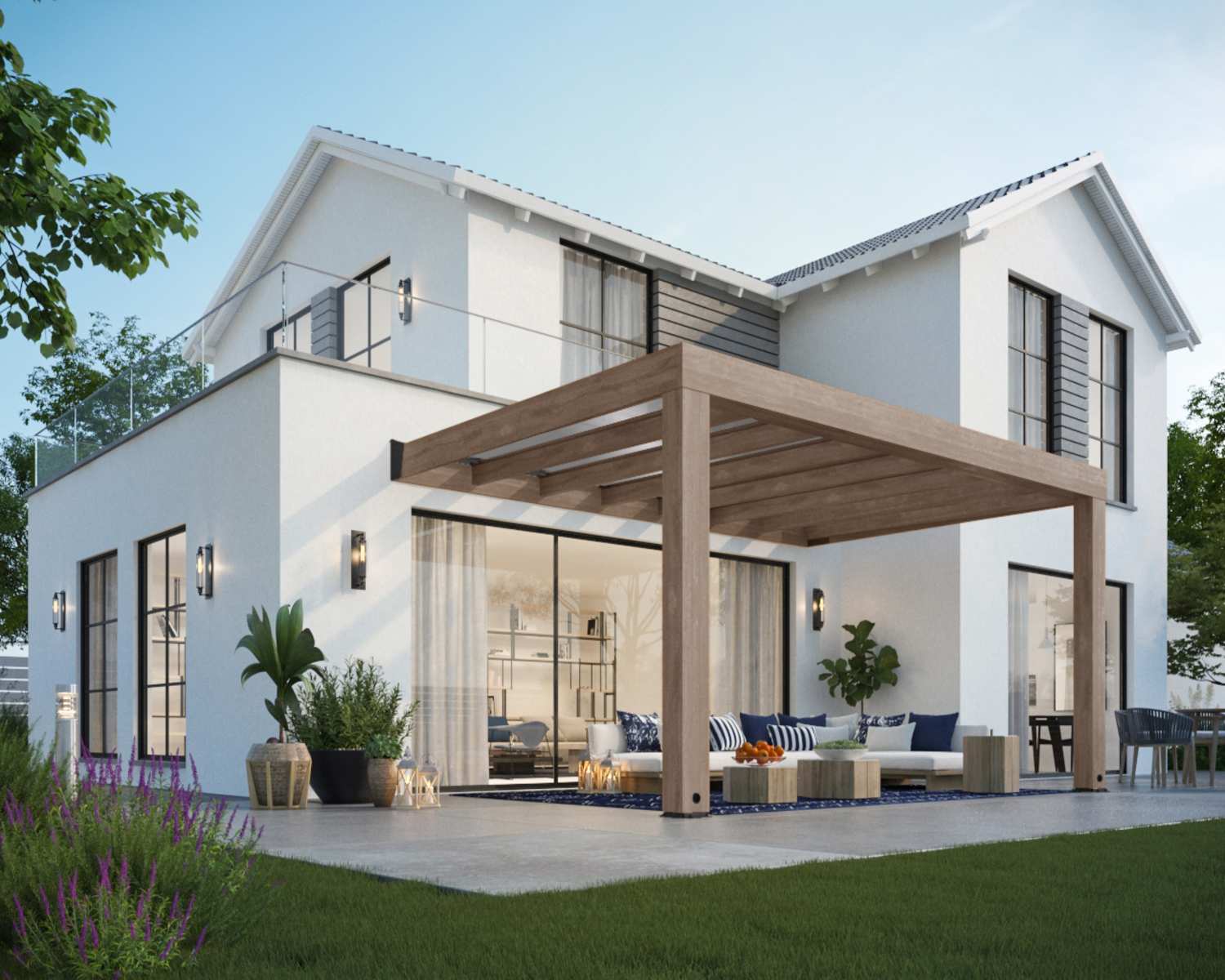 - Modernes Terrassenüberdachungsdesign: Die große Terrassenüberdachung aus Holz hat ein minimalistisches Design in einem natürlichen Material.