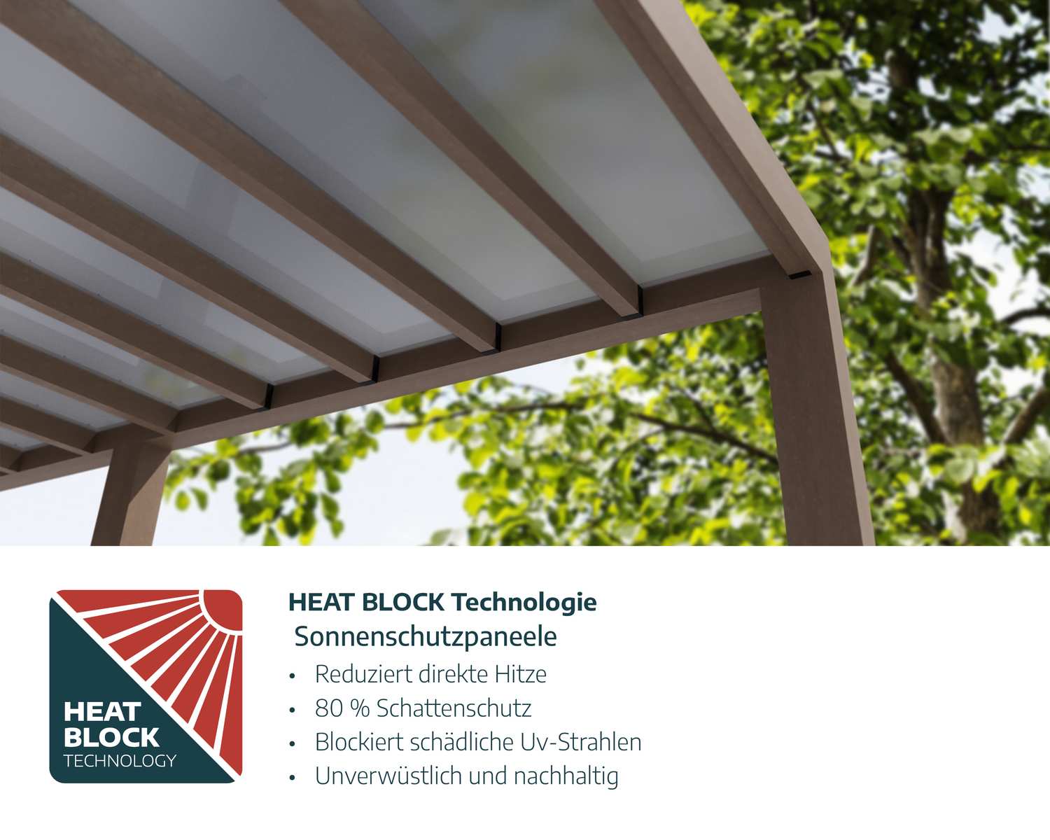 - Heat-Block-Technologie: Das leckfreie Dachsystem besteht aus massiven 3 mm dicken Polycarbonatplatten mit Heat Block Technology, die schädliche UV-Strahlen reduziert und Regen und Tau abhält.