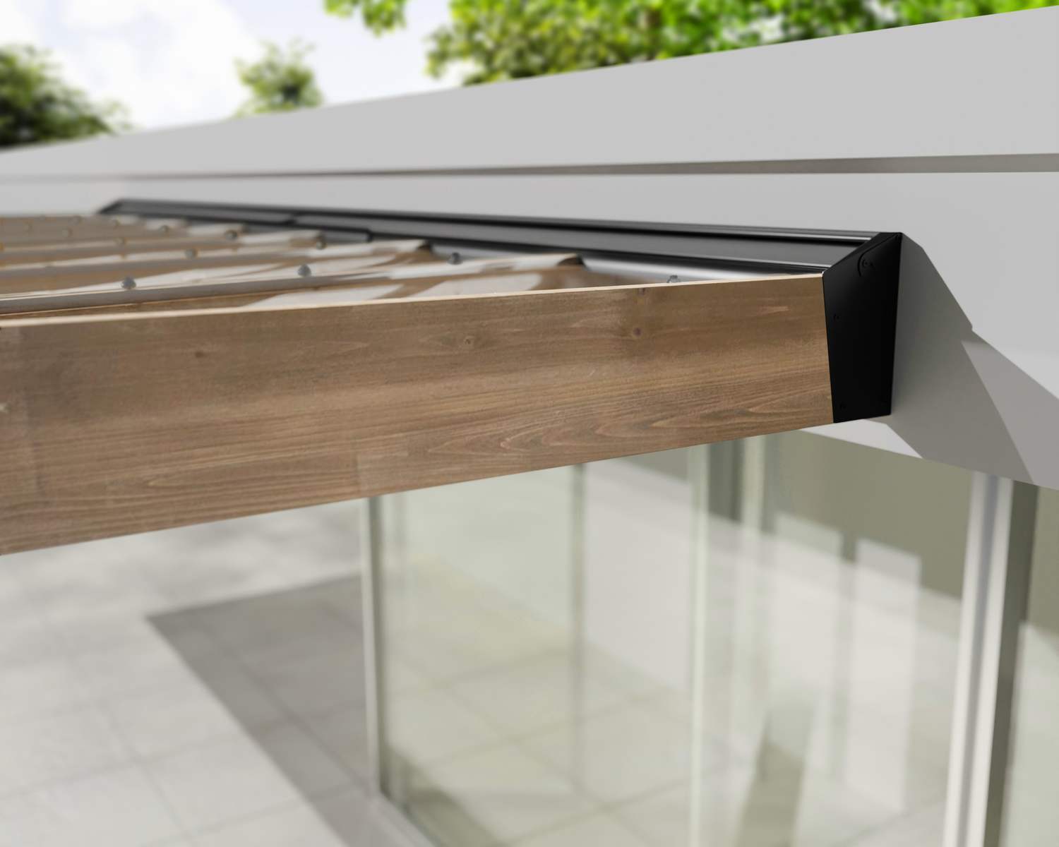 - Eingebaute Dachrinnen: Mit 2 integrierten Regenrinnen, die in den Balken und den vorderen Pfosten versteckt sind und das Regenwasser ableiten.
