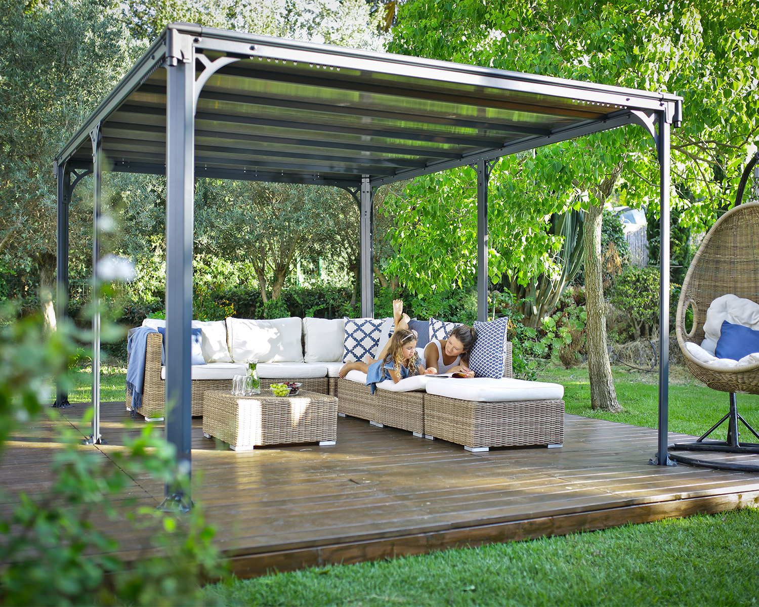 Looking for a gazebo to fit your modern aesthetic? The Milano flat top open gazebo gives you that lounging area, garden décor, and a place to rest and have guests and parties with that clean look you love. The roof panels provide you with the shade you need, while letting in the light you crave. Add curtains to change the look and provide you with some privacy and netting to keep your area bug-free. Decorate it however you want, with the furniture to suit your lifestyle, some textiles for interest and some string lights for ambience