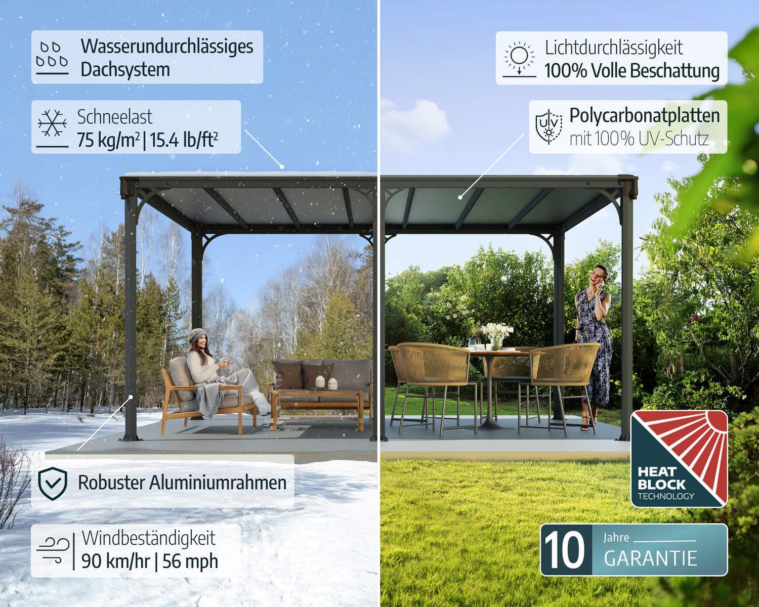 • Nahezu unzerbrechliche, hochschlagfeste, 100% UV-geschützte 6 mm starke, doppelwandige Polycarbonatpaneele, die vor schädlichen UV-Strahlen, Hagel und Schnee schützen