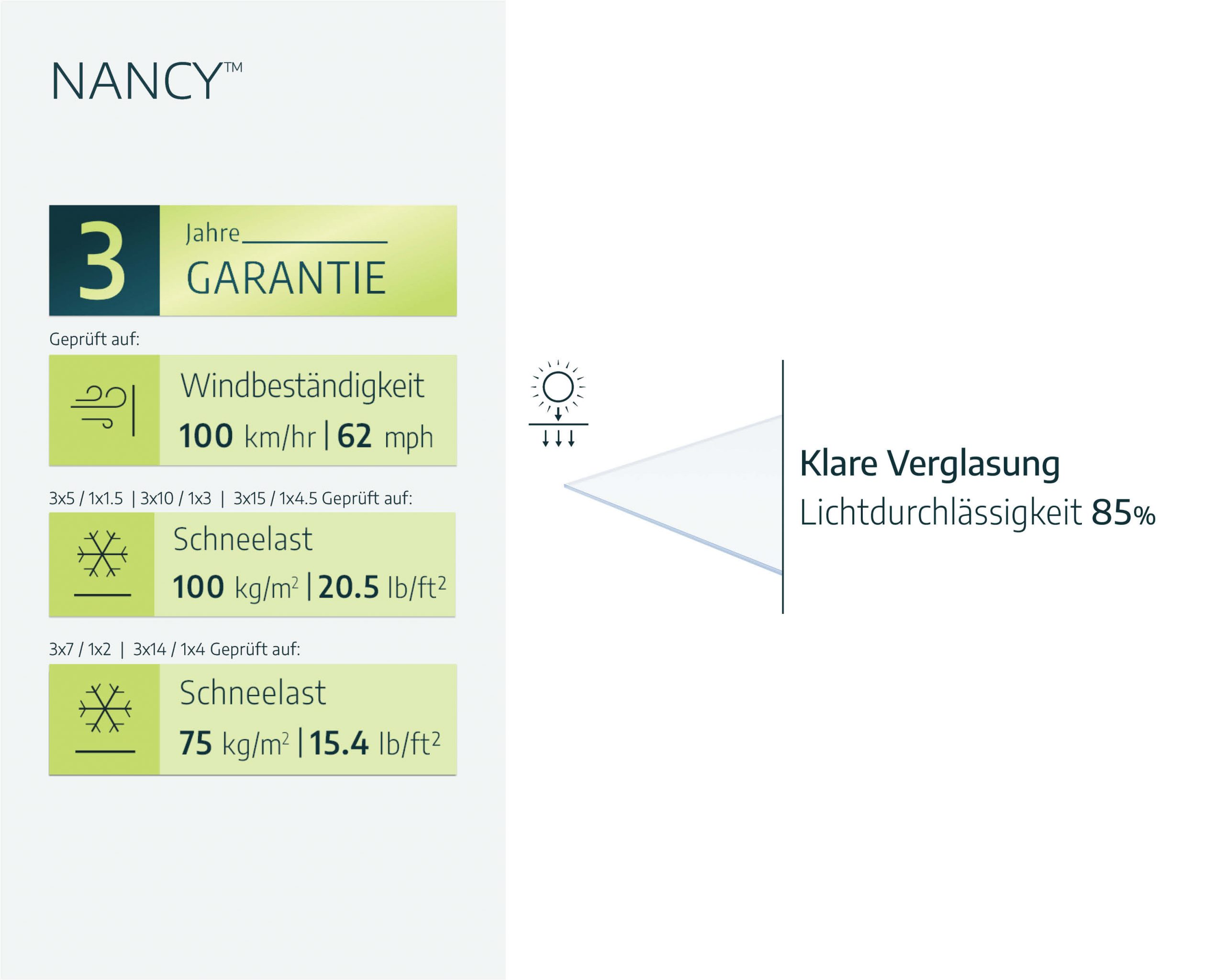 - Ganzjährige Wetterbeständigkeit: Widerstandsfähig gegen Wind, Schnee und Hagel. Hält Windgeschwindigkeiten von bis zu 100 km/h und einer Schneelast von 100 kg/m² stand.
