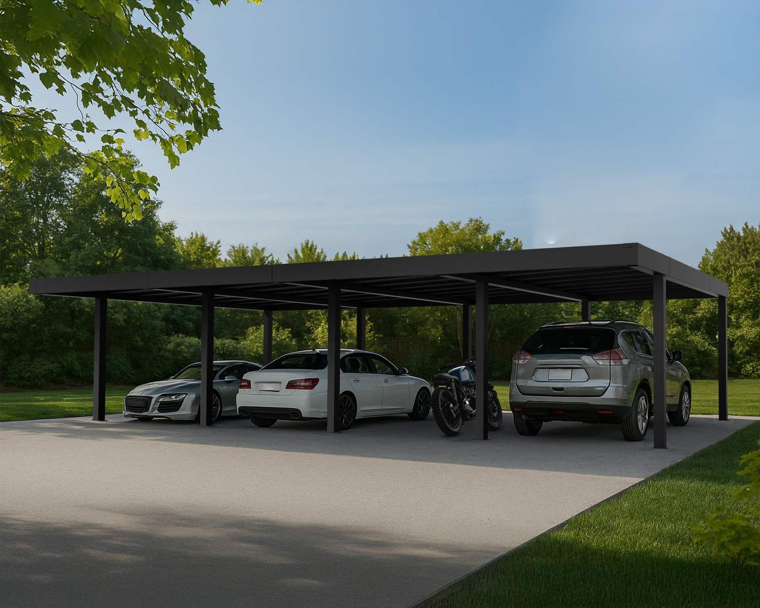 Der Oslo Carport für 4 Autos vereint elegante, moderne Ästhetik mit robuster Funktionalität und bietet ganzjährigen Schutz für Ihre Fahrzeuge. Gefertigt aus rostbeständigem, pulverbeschichtetem Aluminium und mit einem robusten, blickdichten Polycarbonatdach ist dieser 6 x 12 m große Carport wetterfest und wertet gleichzeitig Ihren Außenbereich optisch auf.
