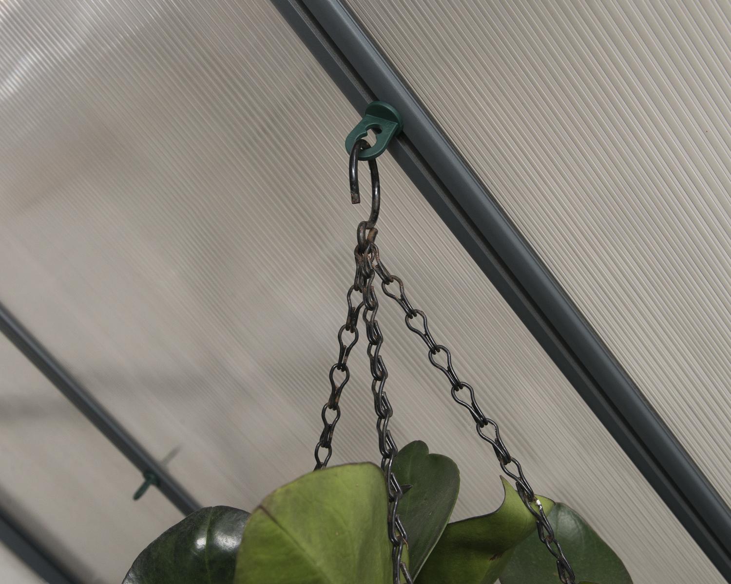 Die Pflanzenaufhänger für Gewächshäuser sind einfach zu handhaben, praktisch und multifunktional. Verwenden Sie die Aufhänger, um Gemüse aufzuhängen, ein Beschattungsset zu befestigen, Bewässerungsschläuche aufzuhängen oder einen Topf oder Korb in Ihrem Palram - Canopia Gewächshaus zu befestigen. Stecken Sie die Aufhänger einfach in die Schienen des Aluminiumrahmens und befestigen Sie sie durch ein einfaches Drehen. Die Pflanzenaufhänger können auch direkt in die "Hochbelastbaren Regal-Kits" von Palram - Canopia eingeklinkt werden, um weitere Aufhängungsmöglichkeiten in Ihrem Garten zu schaffen.