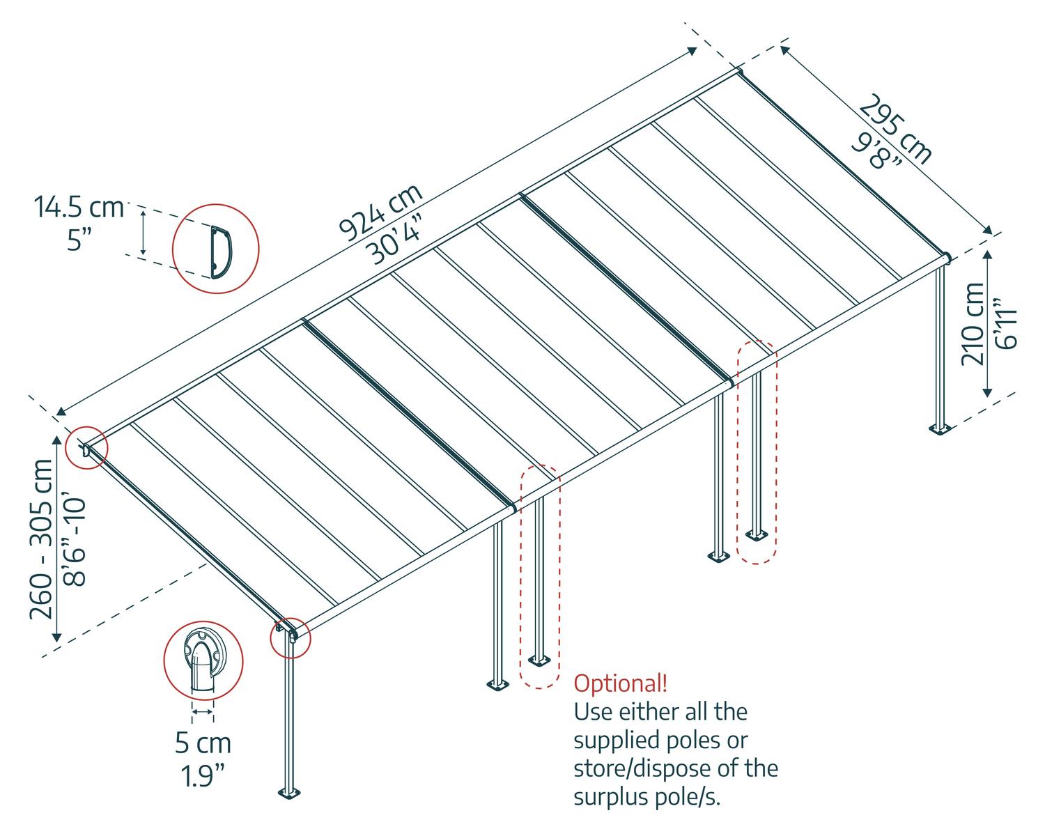 Mit der Tuscany Terrassenüberdachung erhalten Sie genau die richtige Menge an Abdeckung. Das Design der Flachdach-Terrasse verleiht Ihrem Raum ein modernes Flair, ohne mit dem Aussehen Ihres Hauses zu konkurrieren. Durch die flexible Positionierung können Sie die Höhe des Anschlusses an Ihr Haus, den Abstand zum Haus und den Abstand zwischen den vorderen Pfosten selbst bestimmen. Trotz des flachen Daches verfügt die elegante graue Tuscany Terrassenüberdachung über integrierte Regenrinnen, die das Wasser ableiten, so dass Sie trocken bleiben und Ihr Außenbereich bei jedem Wetter genutzt werden kann. Egal, ob Sie mit Ihrer Familie zusammenkommen, eine Grillparty veranstalten oder sich in der Abgeschiedenheit im Freien entspannen, Sie können es das ganze Jahr über genießen. Machen Sie mit der Tuscany Terrassenüberdachung das Beste aus Ihrem Lebensraum im Freien. Modernes Design: Die Flachdach-Terrassenüberdachung hat klare Linien und ein elegantes Aussehen, das Ihrem Haus einen besonderen Reiz verleiht. Langlebige Struktur: Starker, grau beschichteter Aluminiumrahmen mit stabilen ovalen Pfosten (8x4 cm) und Tragarmen aus rostfreiem Stahl für zuverlässige und dauerhafte Beständigkeit