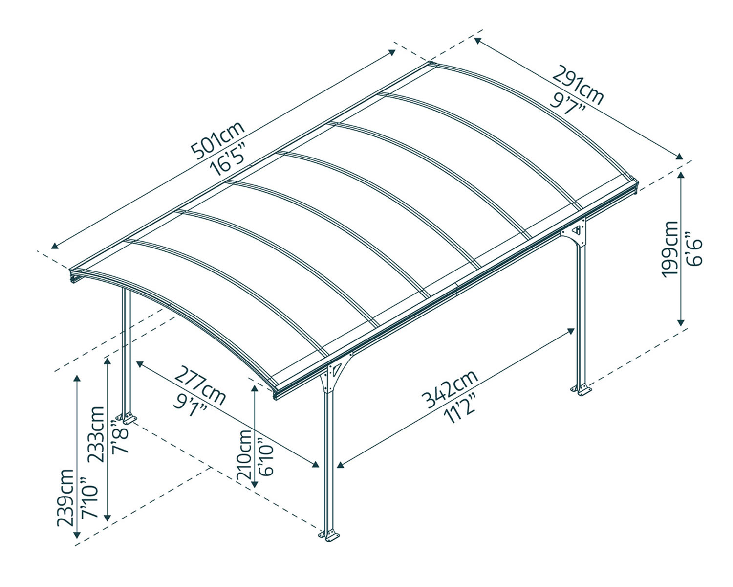 Machen Sie das Beste aus Ihrem Platz mit dem eleganten Vitoria Carport. Das geschwungene Dach wurde zum Schutz Ihres Fahrzeugs oder als Terrassenüberdachung entworfen und sieht überall gut aus, wo Sie es aufstellen. Mit einer Einfahrtsbreite von über 275 cm und einer lichten Höhe von 230 cm bietet der Vitoria Carport viel Platz zum Parken und Begehen Ihres Fahrzeugs oder zum Verweilen darunter. Dieser robuste Einzelcarport verfügt außerdem über eine Schneelastkapazität von bis zu 100 kg/m². Dieser Einzelcarport ist so konstruiert, dass er bei Bedarf umgestellt und wieder aufgebaut werden kann. Zu den weiteren Merkmalen gehören eine Regenrinne zur Ableitung des Regenwassers, Dachpaneele aus hochschlagfestem Polycarbonat, die vollen Schatten spenden, und ein rostfreier Aluminiumrahmen. Verlängern Sie die Lebensdauer Ihres Fahrzeugs und genießen Sie mehr Zeit im Freien mit dem Victoria Carport Kit.